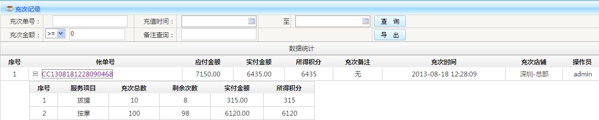 充次記錄:查詢會(huì)員自己的充次記錄并可以導(dǎo)出Excel文檔
