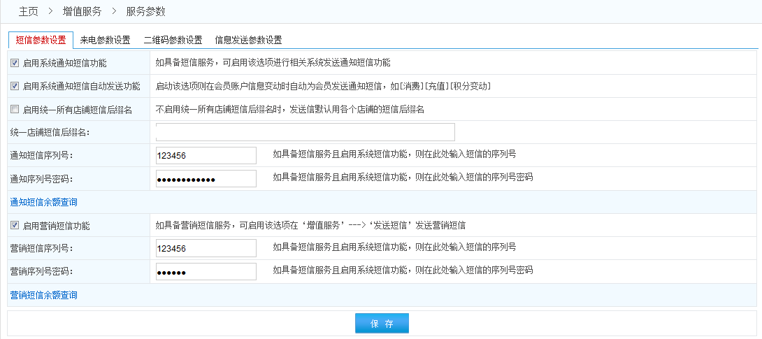 2.通知短信是會(huì)員在本系統(tǒng)中進(jìn)行消費(fèi)充值等操作時(shí)給會(huì)員發(fā)的提醒短信;營(yíng)銷(xiāo)短信是為了促銷(xiāo)等目的專(zhuān)門(mén)為一個(gè)或多個(gè)會(huì)員發(fā)送的(營(yíng)銷(xiāo)短信有且只能在發(fā)送短信的頁(yè)面發(fā)送)